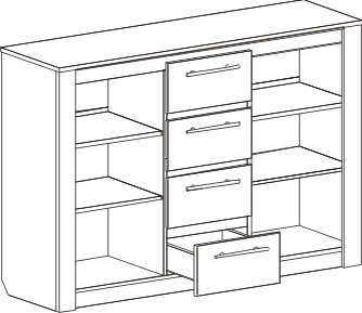 Комод оснащен четырьмя выдвижными ящиками на роликовых направляющих и двумя вместительными отделениями за распашными дверцами.