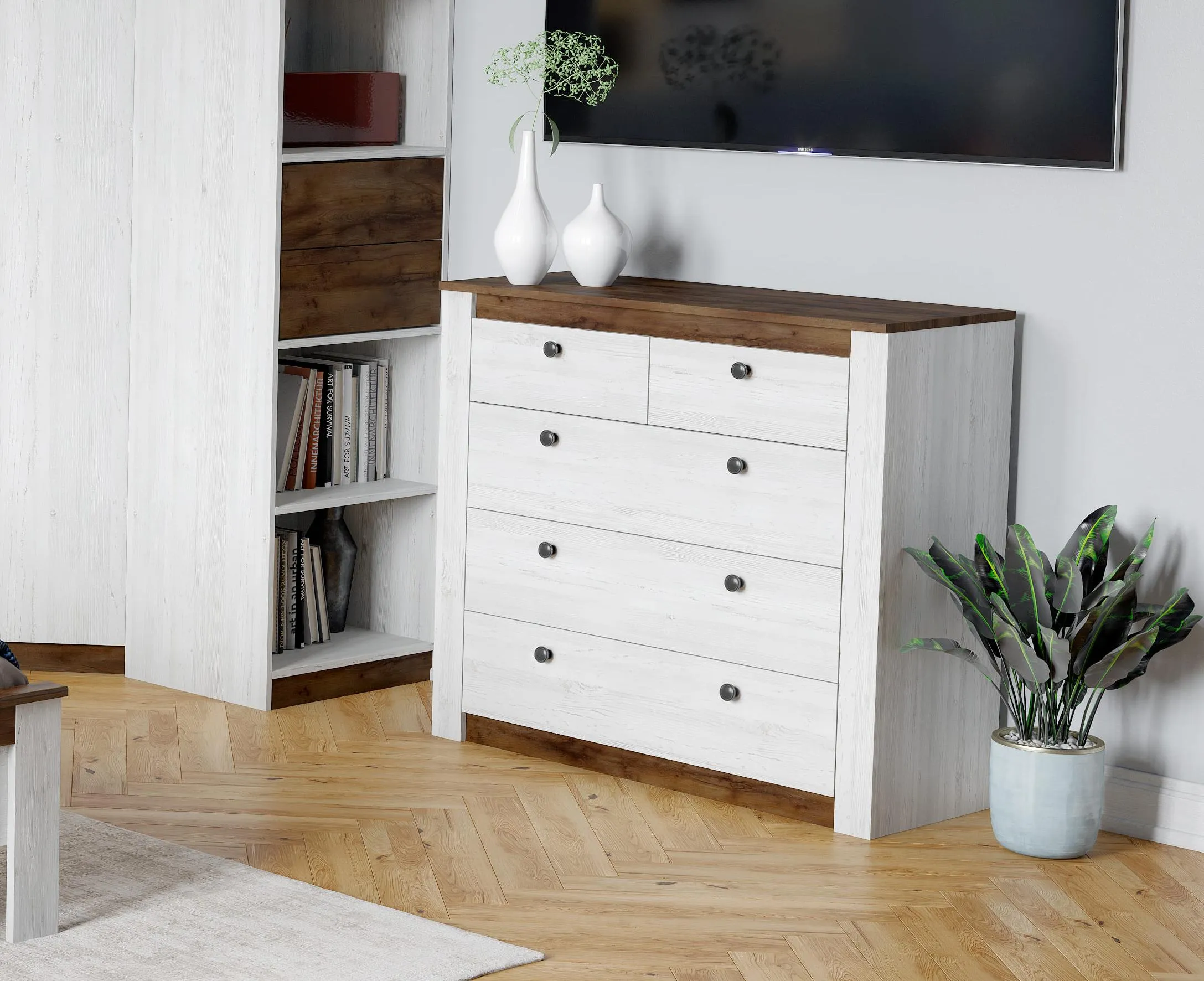 Комод "Даллас" состоит из пяти выдвижных ящиков на шариковых направляющих, что позволяет удобно хранить вещи и поддерживать порядок в комнате.