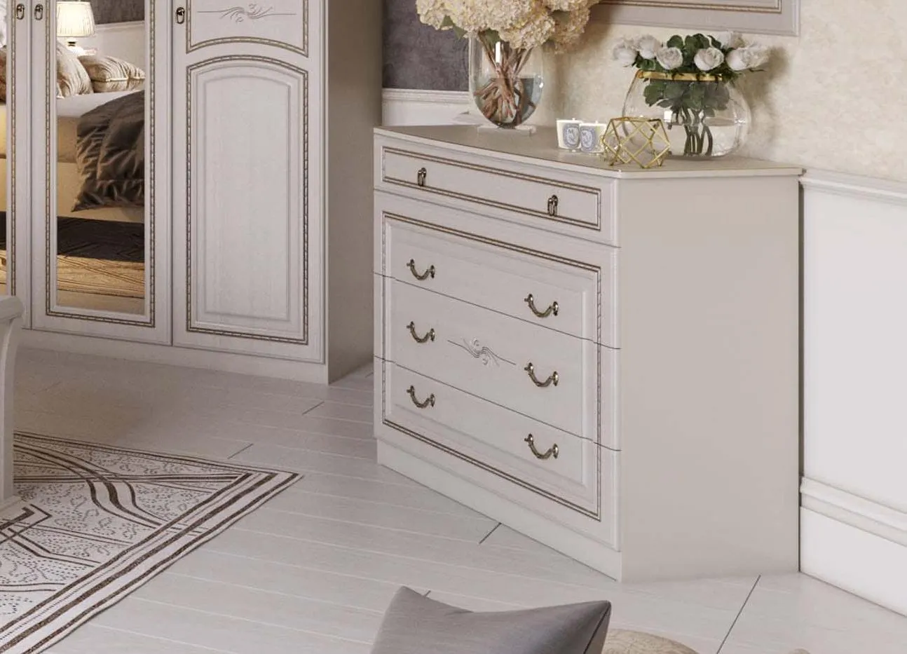 Он отличается роскошным внешним видом и наличием четырех вместительных ящиков. Фасады ящиков декорированы элегантной фрезеровкой с эффектом патины. Для удобства использования ящики оснащены металлическими ручками, имитирующими ковку.