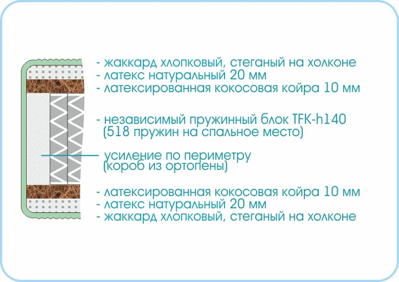 В его основании – независимый пружинный блок, где каждая пружина идеально подстраивается под вес и форму тела человека во время сна. Пружинный блок идеально сочетается с натуральными материалами, находящимися в соотношении 1 к 2, а именно: 1 см кокосовой койры с латексной пропиткой и 2 см натурального латекса.