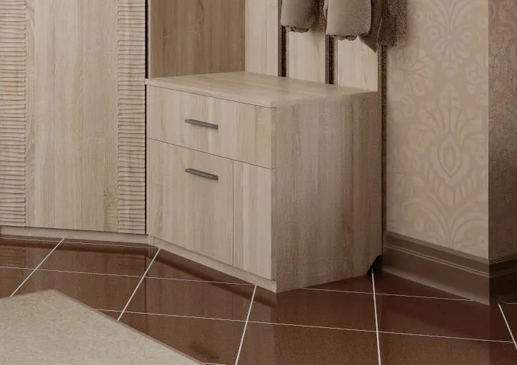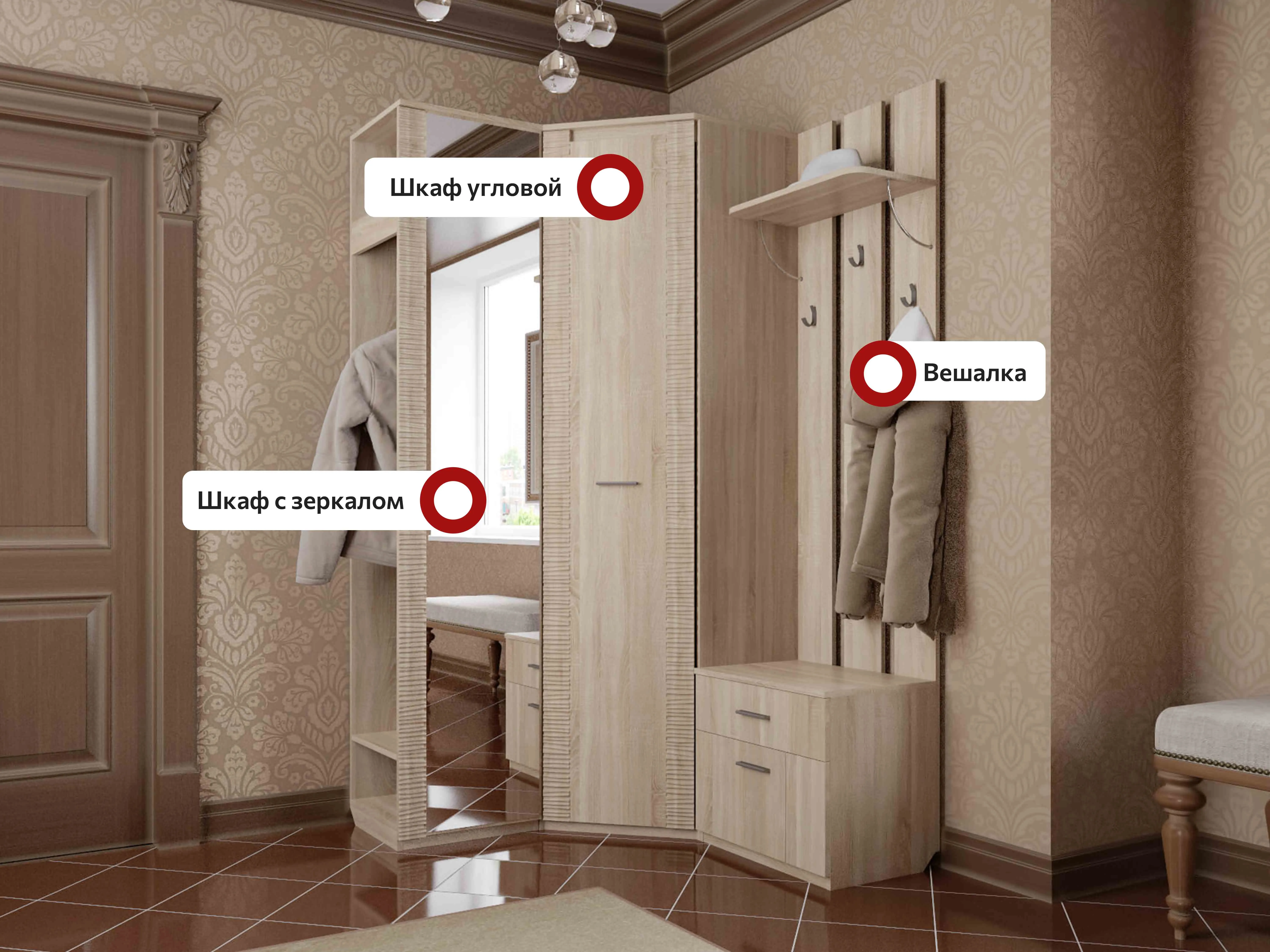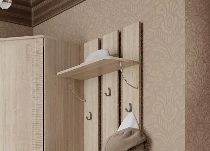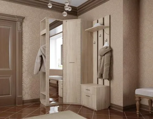 Создатели данной прихожей пошли на маленькую хитрость для экономии пространства: "Элана" имеет очень интересное угловое расположение. В закрытых и открытых шкафах, по всей длине одного из которых расположено зеркало, поместится необходимое количество одежды, обуви, головных уборов, сумок и других необходимых вещей и важных мелочей.