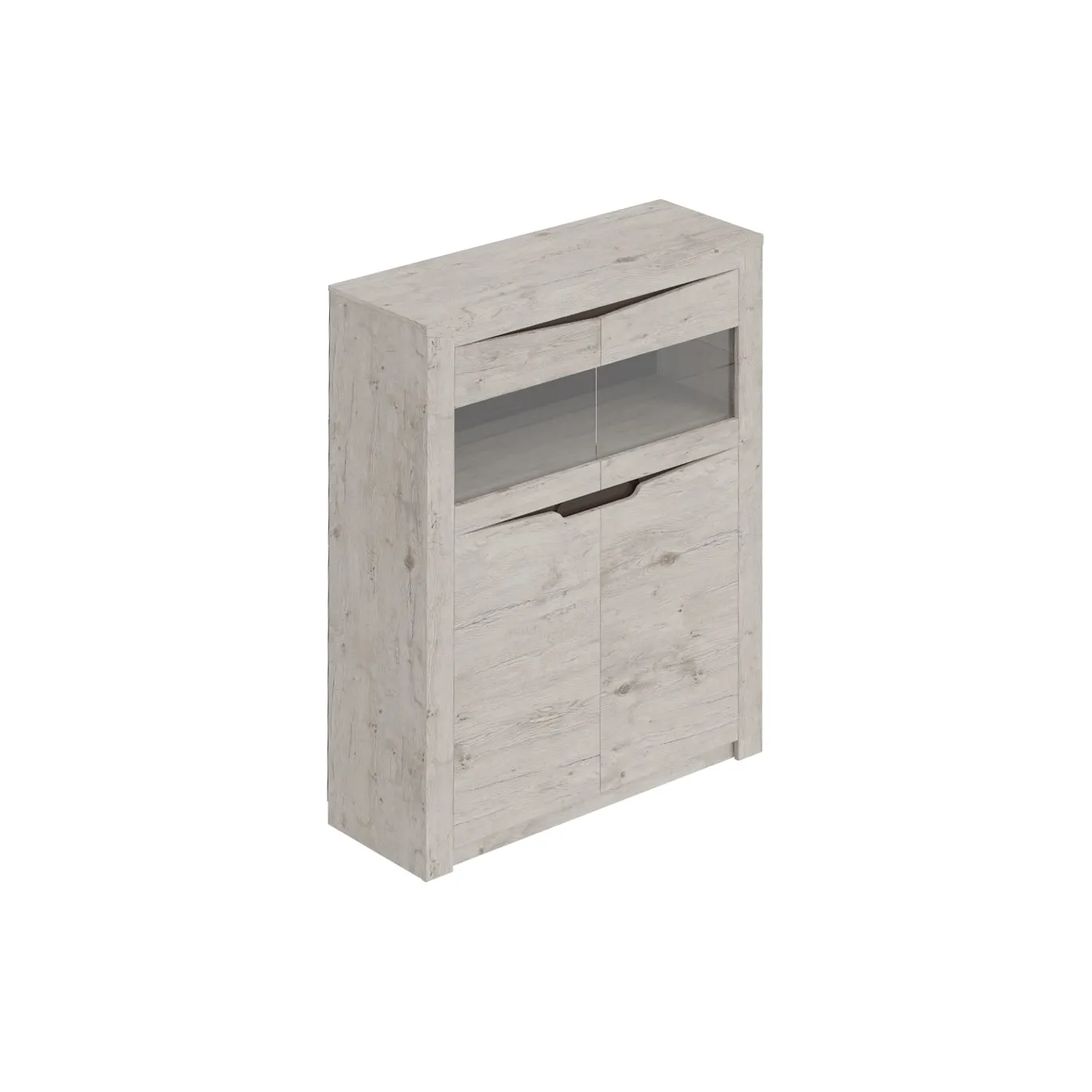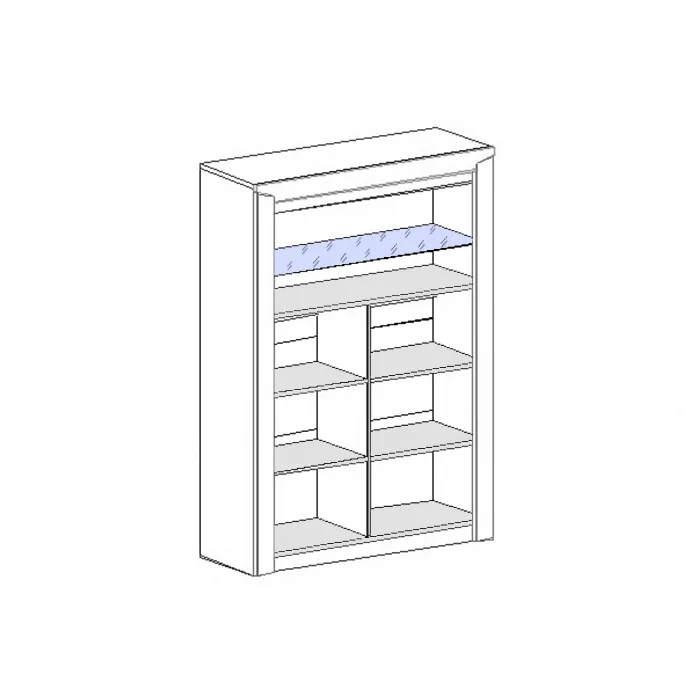 Внутри несъемная полка усиливает жесткость шкафа. Над стационарной полкой устанавливаются одна съемная стеклянная полка, из прозрачного стекла толщиной 5 мм, а в двух нижних отделениях устанавливаются четыре щитовые полки. Внутреннее пространство шкафа закрыто двумя составными дверями, имеющими по одной стеклянной вставке в верхней части.