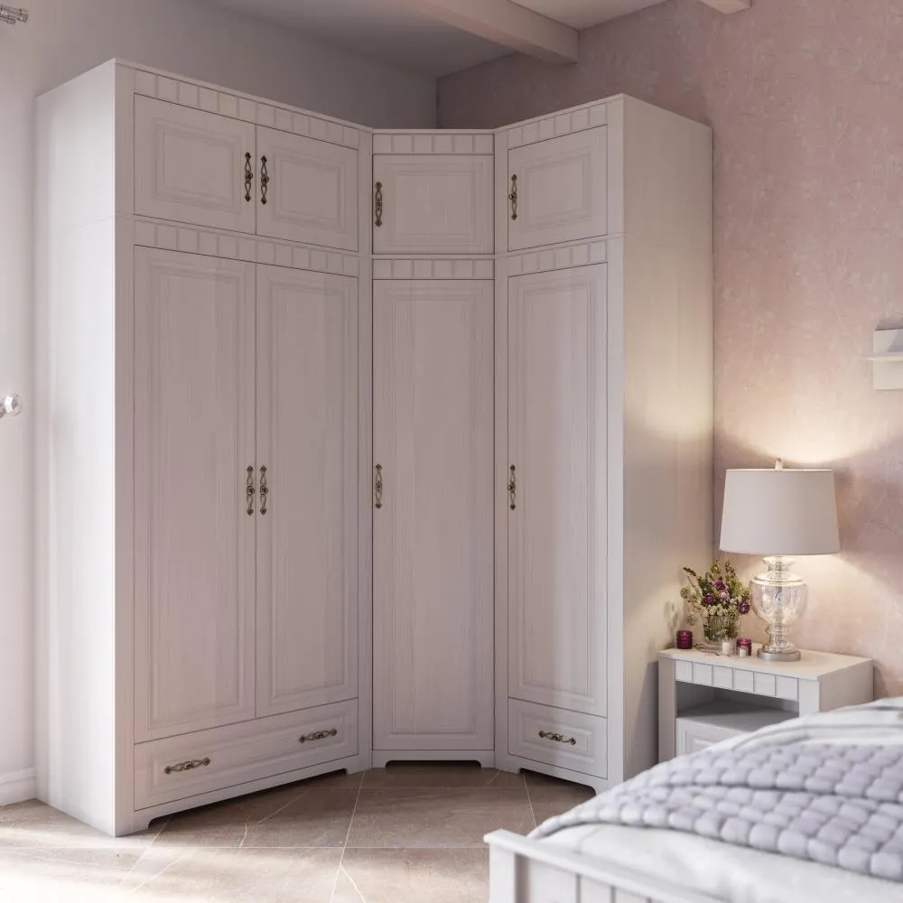 В угловом шкафу за распашной дверью расположены платяное отделение со стальной штангой и полкой сверху, и отделение с полками в количестве 4 шт. Дверь монтируется на любую сторону шкафа.