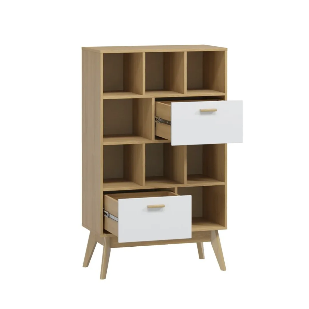 Корпус стеллажа выполнен из ЛДСП цвета натурального дерева, высокие стильные опоры и ручки - из массива березы. Стеллаж прекрасно сочетается с шкафом-витриной Калгари и ТВ тумбой. Прекрасно будет смотреться как в гостиной, так и в детской комнате или спальне.