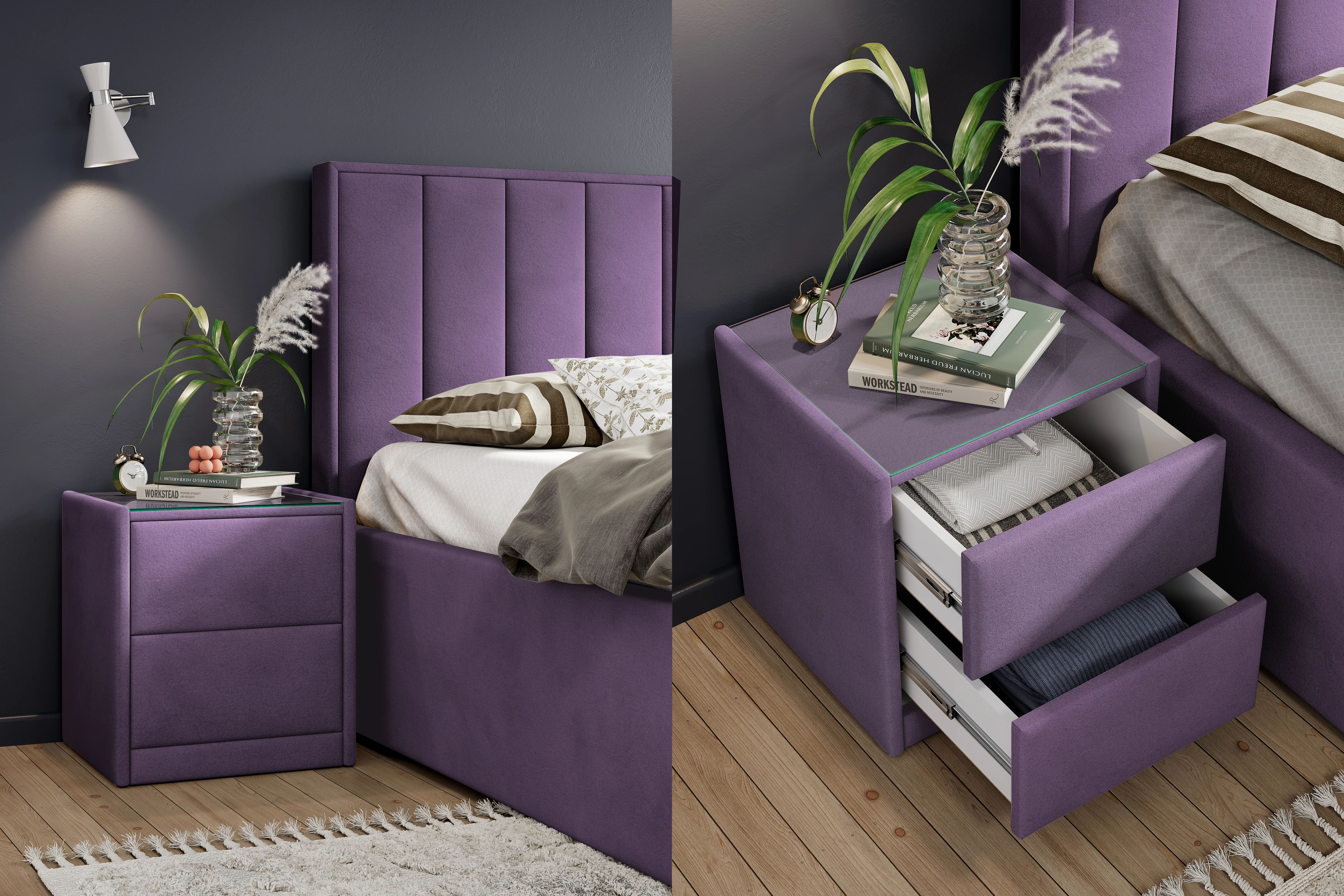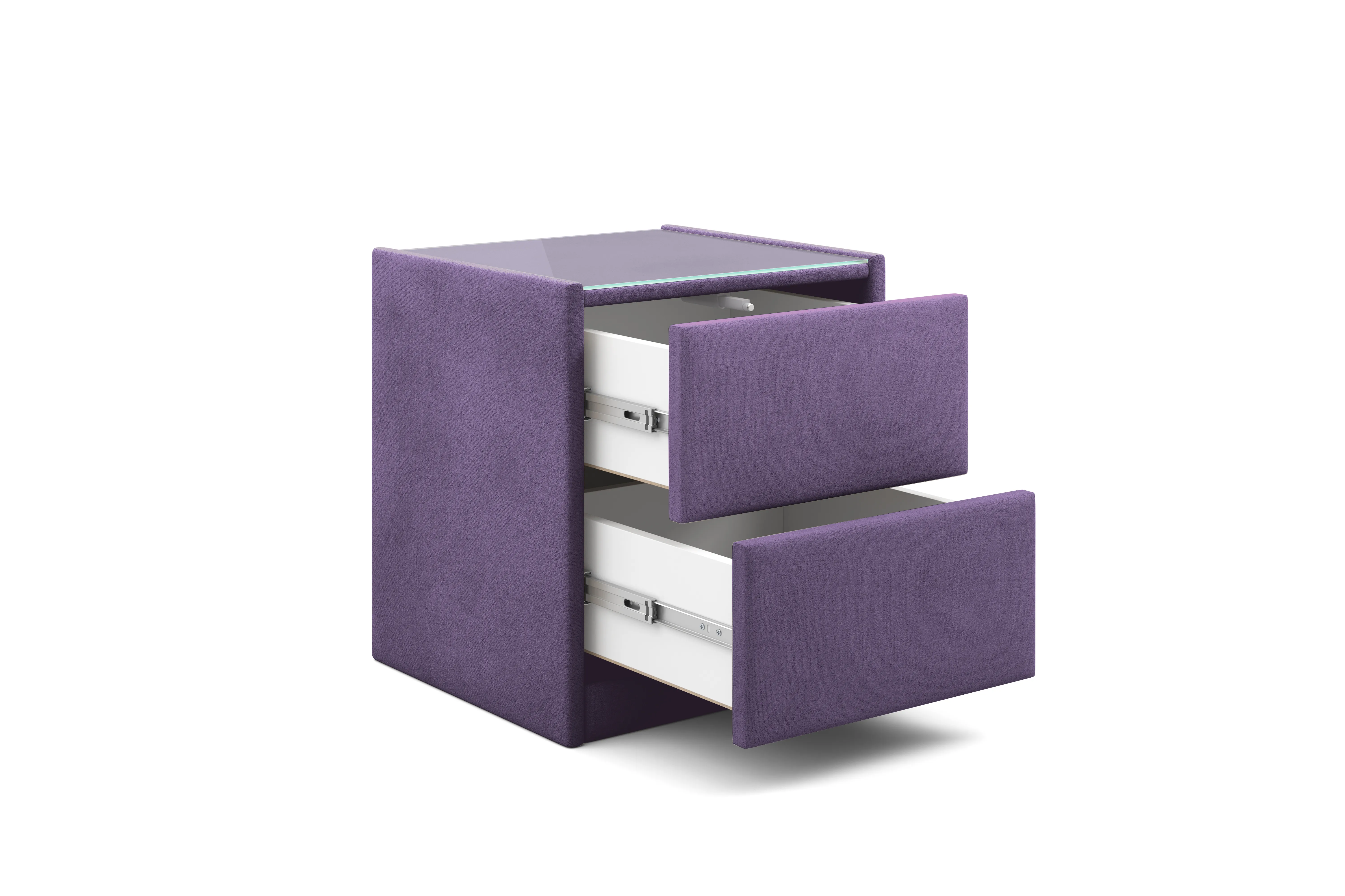 Тумба обтянута высококачественным велюром, что придает ей особый уют и комфорт. Имеет стеклянную столешницу и два вместительных выдвижных ящика с механизмом Push to open. Скругленные торцы модели, минимизируют риск удариться в темноте.