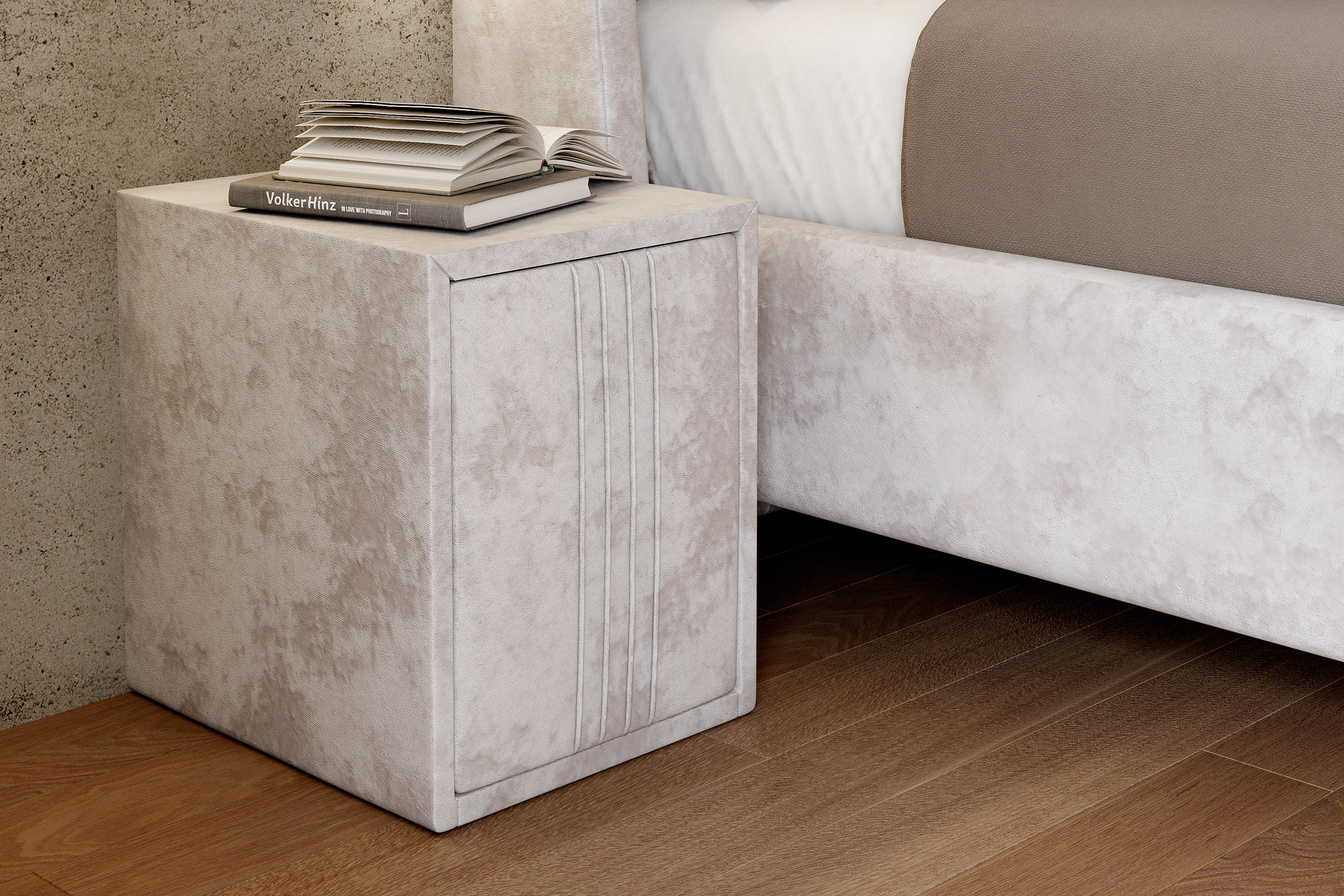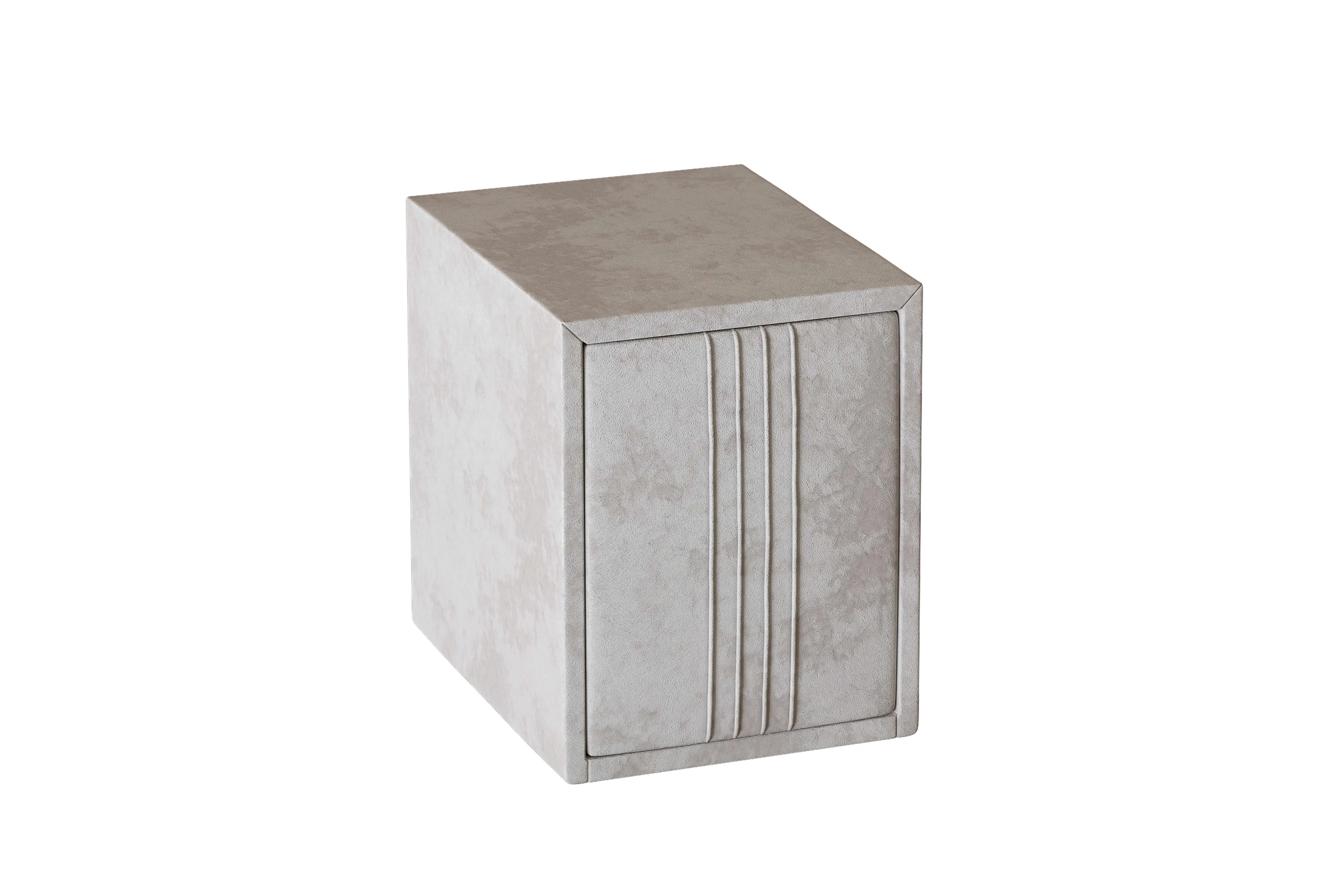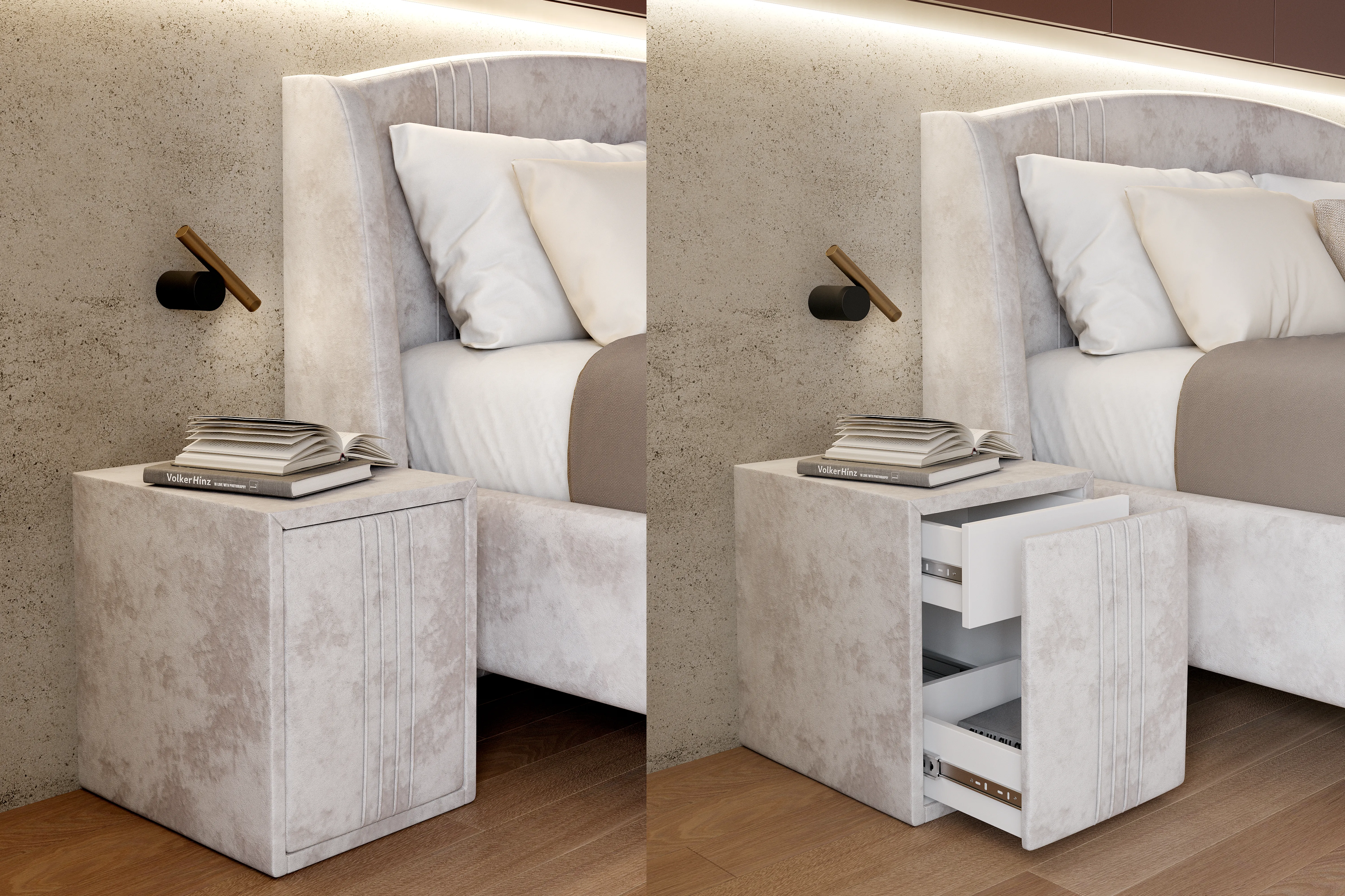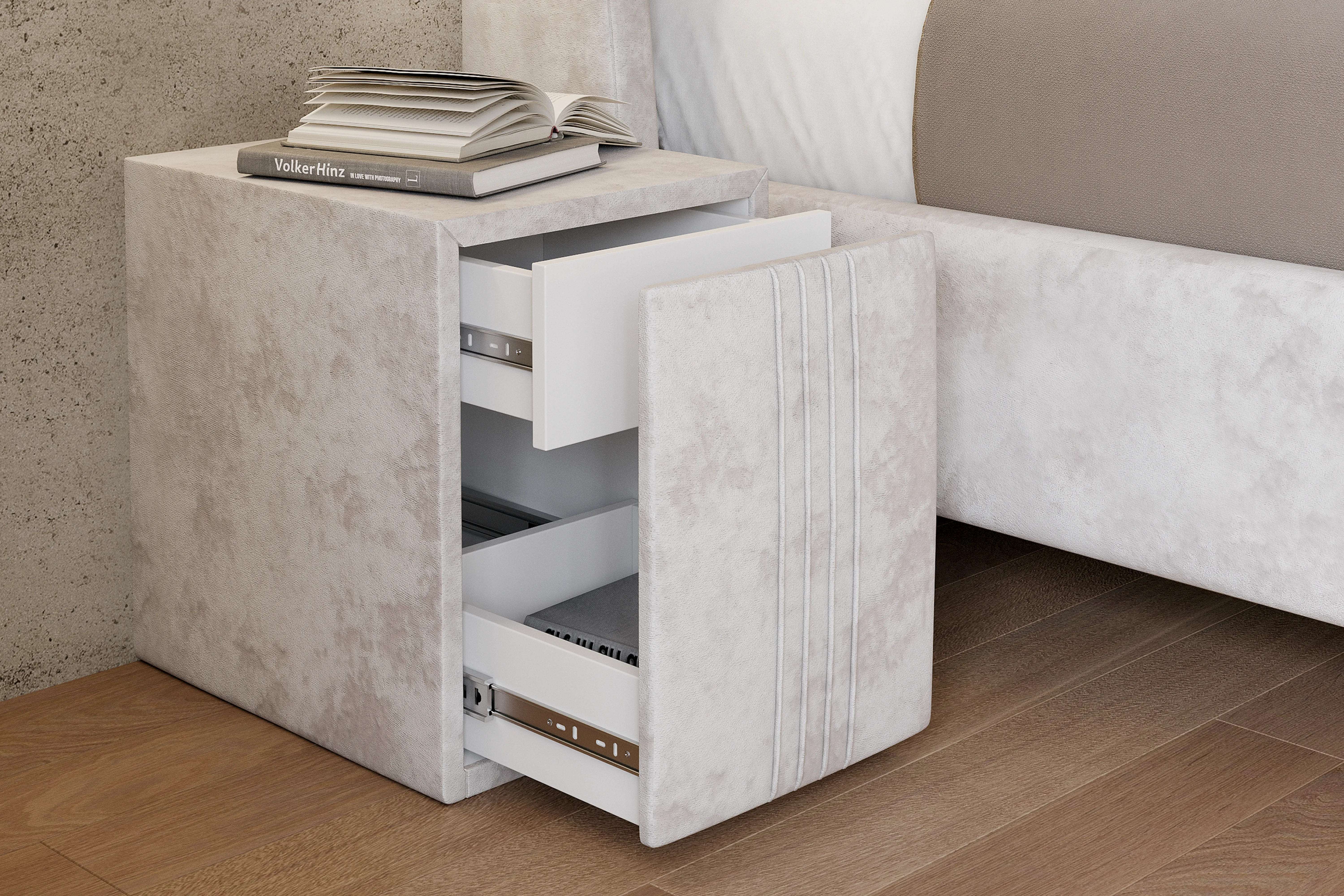 Тумба обтянута высококачественным велюром, имеет два вместительных выдвижных ящика с механизмом push to open. Скругленные торцы модели, минимизируют риск удариться в темноте.