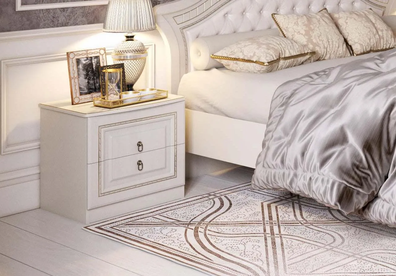 Она отличается роскошным внешним видом, оснащена двумя выдвижными ящиками, которые идеально подходят для хранения личных вещей, книг или других предметов. Фасады ящиков декорированы элегантной фрезеровкой с эффектом патины. Для удобства использования ящики оснащены металлическими ручками, имитирующими ковку.
