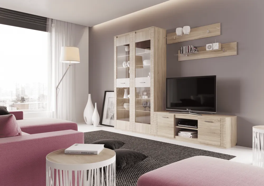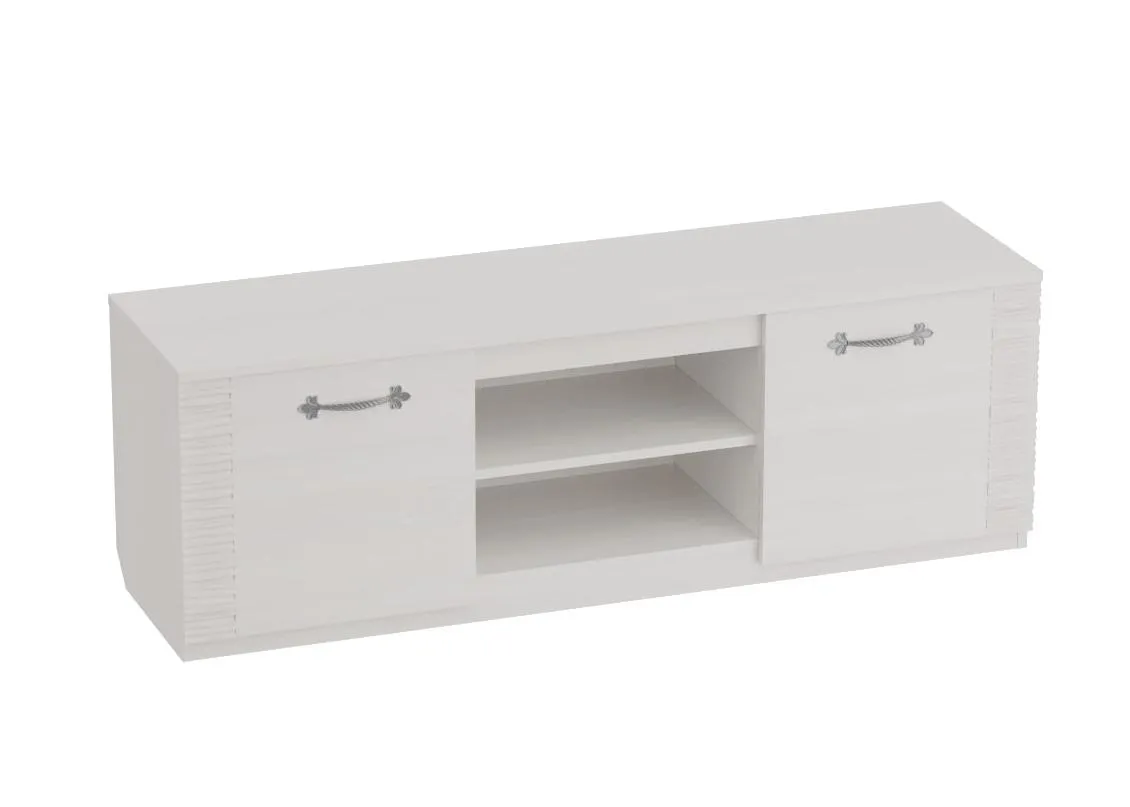 Тумба по ТВ имеет две ниши, закрытые дверцами и центральная открытая с одной съёмной полкой. Под крышкой установлена стеклянная панель для крепления светильников "HLT Prismatic FT".