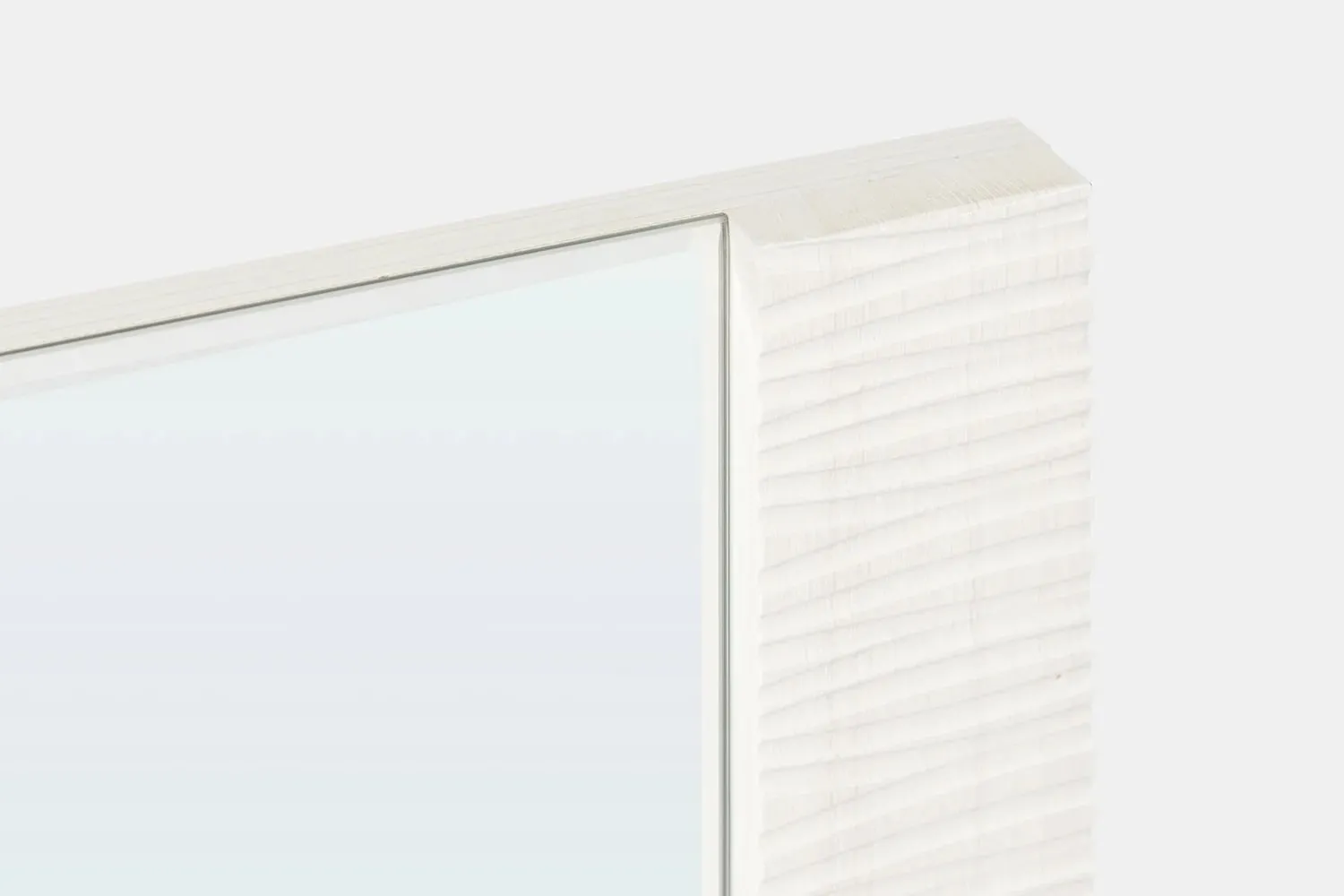 Зеркало имеет дополнительный элемент декора - накладка из МДФ с фрезой и отлично подходит для спальни.